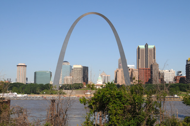 When I did get going, I backtracked in a sense. US50 goes around the south side of St. Louis. I wanted to get a picture of the skyline. Being morning, that means I wanted to be east of the city. So I went north into downtown, crossed back over the Mississippi, went to a waterfront area, and got the following picture.