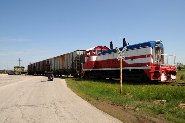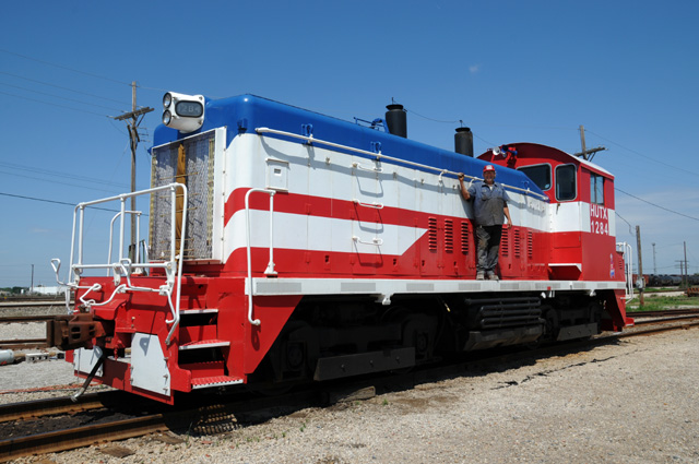As I was leaving, crossing the railroad track, I noticed that the engineer was out of the engine and walking to his pickup truck. I stopped and walked back to talk to him. Turns out he and some co-workers painted the engine. Here's Douglas on his engine. [Douglas, if you would like to have a full resolution copy of this picture, you can click on it to get the high rez picture in your browser, then download the high rez picture by right clicking on the picture and selecting "Save picture as..."]