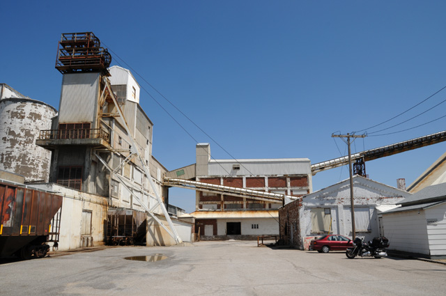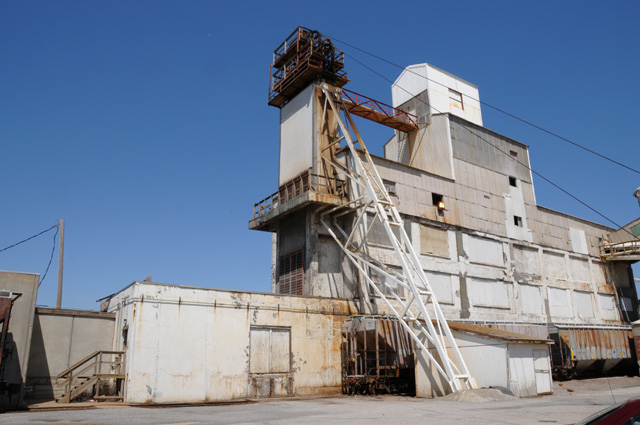This is the complex where the elevator is located. The elevator is on the left. The big wheels at the top of the building on the left are immediately above the elevator. They are pulleys for the cables that hold the elevator. The cables come up over the pulleys, and down to the right. The motor is in the building on the right.