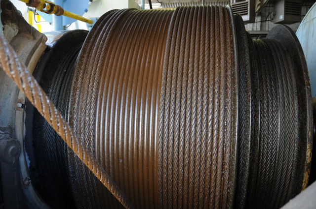 Here are the pulleys and cables at the top of the elevator.