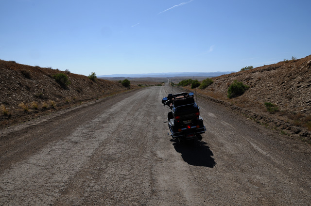 After that I had my normal lunch, in Montrose. Then off again through Grand Junction and on into Utah. I tried to stay on old US50 as long as I could, but was eventually forced off because the road is no longer maintained. The road had been OK, but suddenly got bad. I flagged down a truck that was coming from the bad part and asked the driver if the road continued to be paved or if it got worse, he said it was paved and was not much worse, and I asked how far to the next town, and he said five miles to the Interstate. I did not turn back, and continued the five miles. This photo shows the state of the road when I stopped the truck driver. It got worse. Pot holes, washboard, I was going about 15-20 miles an hour. Fortunately it was only five miles, then I got on I-70, the modern US50.