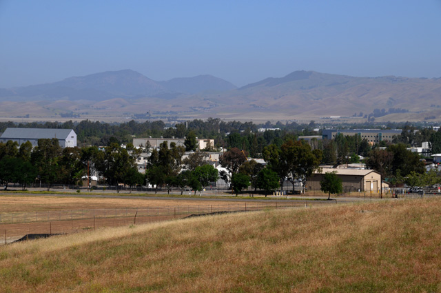 Historic US50 runs through Livermore, as I said. You may recall that I mentioned Livermore on the Introduction page. I was in Livermore around New Years Day in 1964. I was a Senior at Purdue, and I had an interview with Lawrence Radiation Laboratory in Livermore. They offered me a job at $5 more per month than RCA Laboratories had offered. The RCA salary offer was $655 per month. Not a lot, was it. But in those days it wasn't bad. I decided to find the Lawrence Radiation Laboratory when I passed through Livermore. First, you have to note a name change, since 1971 it has been called Lawrence Livermore National Laboratory. A more public sensitive name, I suppose. It does secret types of work, so all I could see was a fence with buildings way back from the fence. It didn't seem to be a good picture for my travelogue. But, there is a hill just down the road. I rode the bike past the hill, turned around, and parked on the hill to get this shot.