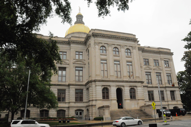 I stopped at the Georgia State Capitol in Atlanta. It was raining a little, so I made it as quick as I could. I had to ride around the Capitol and surrounding streets several times to find a place to park. It was only sprinkling when I parked, it was beginning a moderate rain as I pulled out of the parking spot. The Capitol is surrounded by close buildings, so it is hard to get a good picture. This was taken with a wide angle.
