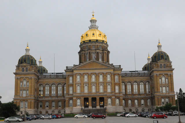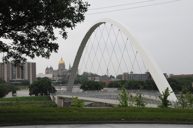 Yesterday and today I have been in two states I had never been in before, Iowa and Nebraska. I left Mt Pleasant, Iowa about 8:30 this morning. I knew there was bad weather ahead. There was an area of storms approaching Des Moines, just where I was headed. At the appropriate time I put on my rain jacket and my gaiters (boot covers to keep my boots dry -- I didn't use them the other day and it took two days for my boots to dry). I wasn't sure if I would make it all the way to Des Moines because it looked bad on radar (Ralph, I am using the myradar app, thanks for suggesting it). I didn't know if I would divert to the north, or hole up for an hour. I didn't have to do either, there was a bright area in the middle of the darkness ahead and that's exactly where my road was going. I was in light rain, even arriving at Des Moines. I got my pictures in the rain and got out.