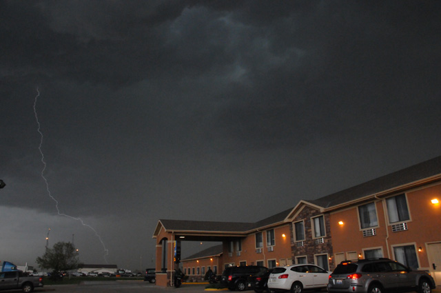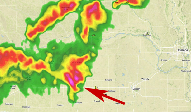 I quit riding earlier than I had planned this evening, I wanted to go another hundred miles. I stopped to get gas, saw that the sky was dark ahead, and looked at radar on my iPhone. When I saw how bad it was, I decided immediately to stop for the night. There was a Comfort Inn next door to the gas station, so I checked in. Here's another radar picture. When I stopped the storm was about ten miles away. This radar picture was taken when the rain started. I am at the tip of the arrow. You can see Lincoln to the right, and Omaha further to the right and up a bit. We had some hail, but my bike was safely parked under the portico of the motel.