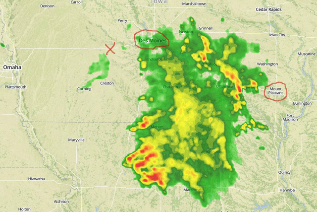 As soon as I spotted a McDonalds, I stopped, got my chocolate shake, and grabbed this radar picture. I have circled in red Mount Pleasant where I started the day and Des Moines where I had just been getting pictures. I marked a red X where I was sitting sipping my chocolate shake. I went through all that rain and the rain was always light where I happened to be. Some times you get lucky.