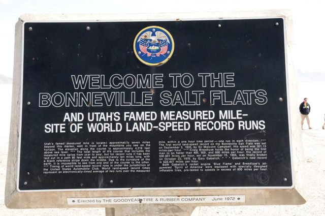 Here's part of the text on the sign, "Utah's famed measured mile is located approximately seven miles beyond this marker, well in front of the mountains you see on the horizon... The first world land-speed record on the Bonneville Salt Flats was set on September 3, 1935, by Sir Malcolm Campbell. His speed was 301.13 miles per hour. Craig Breedlove holds the honor of being the first man to go faster than 400, 500, and 600 miles per hour. His record of 600.601 miles per hour, set on November 15, 1965, was finally broken on October 23, 1970 by Gary Gabelich. Gabelich's new record is 622.407 miles per hour..."