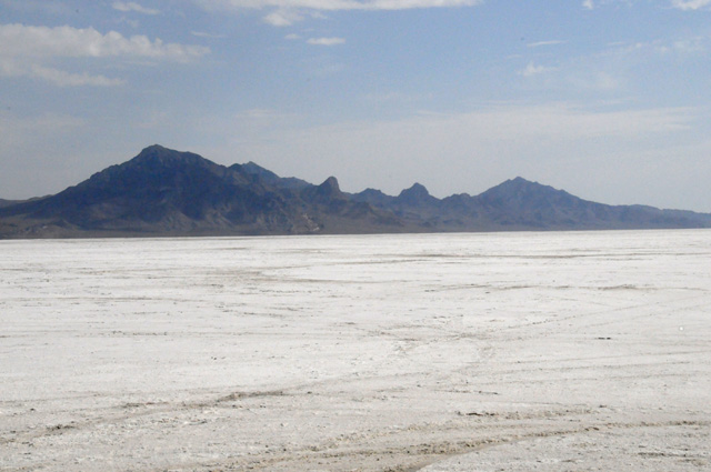 I couldn't resist the temptation to take a side trip. This is as far as I could go on a paved road. After this, you ride on the salt. I decided to not ride on the salt. Those "mountains you see on the horizon" in the previous picture are the mountains you see close up in this picture. The measured mile is somewhere ahead of this point, along the salt road.