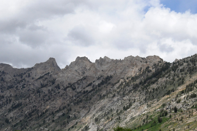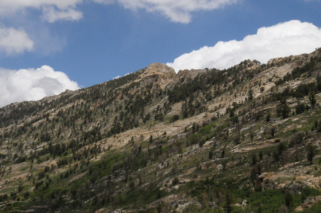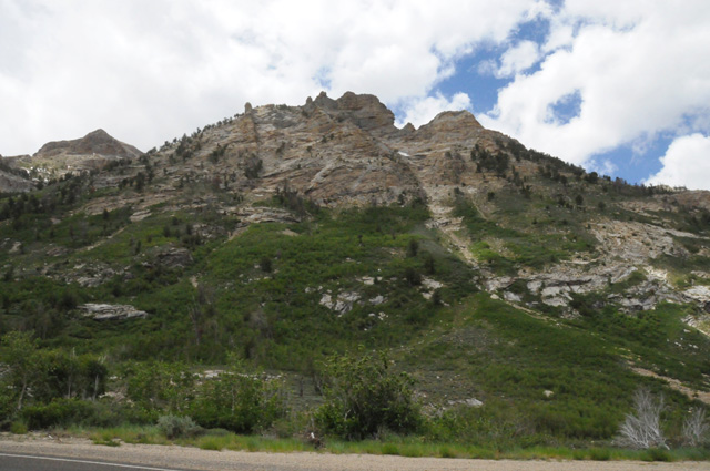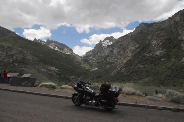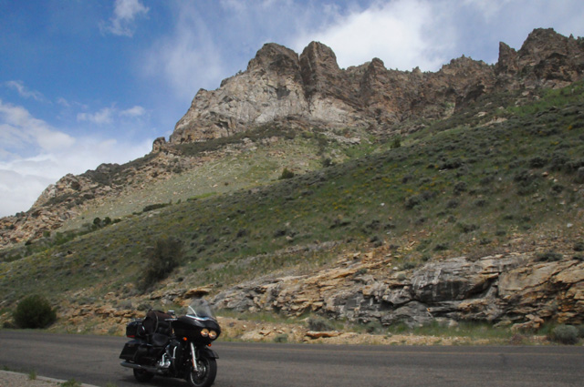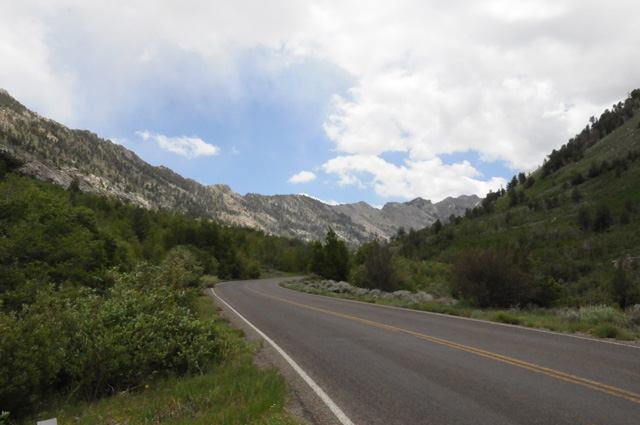 Yesterday, I was told about a canyon south of Elko, NV, the Lamoille Canyon. I knew it was only 20 miles off my route (which was I-80) and that the canyon is about 12 miles long. Elko is almost half the way from Salt Lake City to Carson City. I was in Elko before Noon. Again, I couldn't resist the temptation. Another side trip. Lamoille Canyon is in the Ruby Mountains, the same mountains you saw in the previous picture, about halfway down the range. Here I am approaching the canyon, looking up at the mountains.