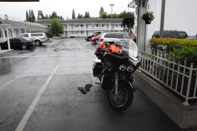 It wasn't really raining, it was sort of misting. The air was full of water and anything the air touched got wet. In the picture above, my bike was under a roof overnight, so it stayed dry. You can see the water line on the pavement. Those two things lying by the bike are my gaitors, rain jackets for my boots. You can see my rain jacket lying on the bike. I wore it all day. I wore the gaitors most of the day. It was a wet day. I stayed dry, because I have good protection.