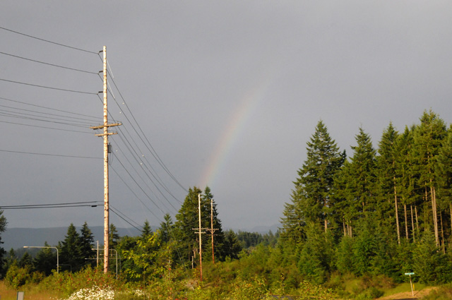 Even though it was late in the afternoon, perhaps time to call it a day, I kept on riding. This final shot was taken on a shortcut connecting I-5 to I-90. It is the diagonal road at the top left of my map. Pretty much the halfway point of my journey. At the time I thought the rainbow was the sign that I was out of the rain. Not so, I had more rain after taking this picture. A few minutes later the rainbow was a full arch, but I couldn't stop to take another picture. That was the only sun I saw all day.