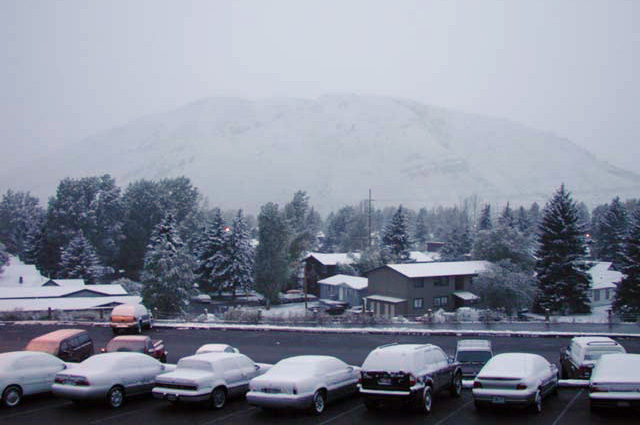 I remember our last morning there in 2000, it was September 23. It had snowed overnight. I was concerned about getting out of Jackson Hole. We would be going through the same pass I just came through on the Harley. We made it just fine, but snow plows had been in the pass. Here's what I saw from our room that morning. That was an early snow, the night of September 22.