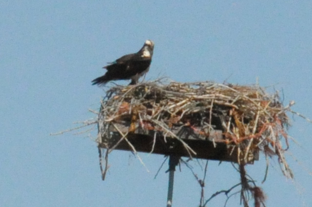 OK, what is this bird? When I took the picture, I thought it might be a bald eagle. Now I don't think so. It might be an osprey. Somebody tell me. This nest is on a platform on top of an electric pole.