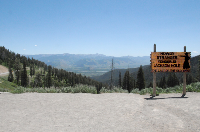 Now I have climbed the west side of the Grand Tetons, and I am in Teton Pass, about 8,400 feel elevation, looking down east to Jackson Hole. The sign says, "Howdy Stranger, Yonder is Jackson Hole, the Last of the Old West."