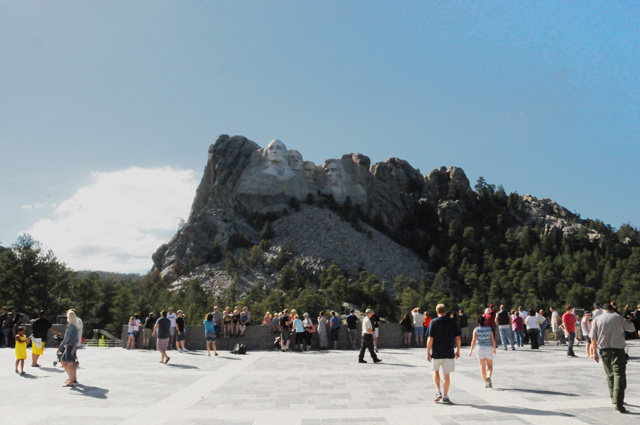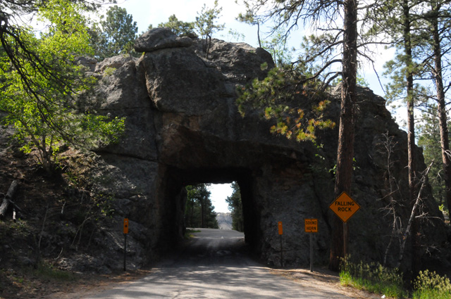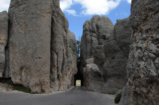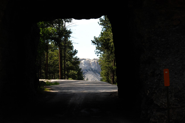 I am off the Needles Highway, approaching Mount Rushmore, and pass through another tunnel. You can see Mount Rushmore through the tunnel.