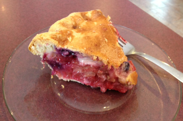 I ordered my chocolate shake, and noticed that they have several types of pies. I was enchanted by the Bumbleberry pie, I had to try it. It has rhubarb, strawberries, apple, raspberries, blueberries, and blackberries. I enjoyed it.