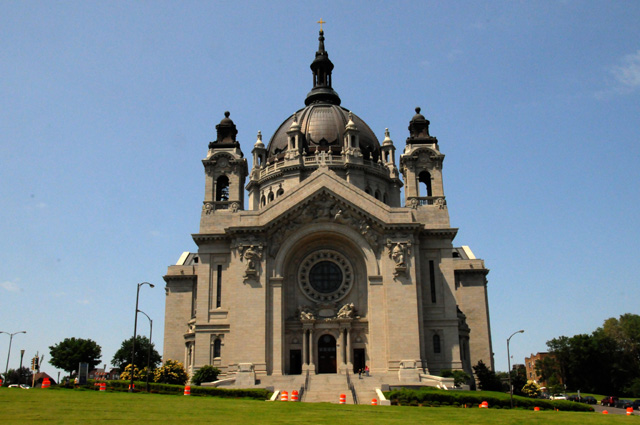 Just down an avenue from the Capitol is the Cathedral of Saint Paul. You can see one from the other. They don't face each other, they are each at 45 degrees from facing one another. The Capitol faces south, the Cathedral faces east, and the avenue is northeast-southwest.