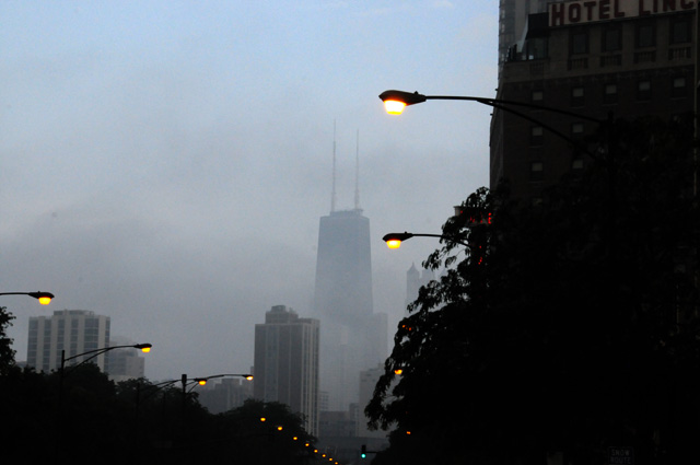 It was a rainy day. A miserable rainy day. Leaving Madison, I did not wear my rain jacket. A few miles down the road I put it on. Then the sun came out and I got hot so I took off the rain jacket. Then the sun disappeared and it looked like rain would come any moment, so I put it back on. And the rain did come. I was unable to read my GPS and I needed it to find the Harley-Davidson headquarters and the museum in Milwaukee. I suffered through all that, and then more later. I had to go through Chicago to get to Indiana. Tomorrow is a holiday. Traffic was terrible, and there was the on and off light rain. I was averaging about 1/10 mph on the Interstate. My bike gets hot under such conditions. So hot, that I decided to abandon riding and go to a McDonalds. I did not get a chocolate shake, I already had my daily allotment at the Harley-Davidson Museum. So I had a Coke. After a long wait, I tried riding again. And I abandoned it again. I should have gone around Chicago, through Iowa I suppose. Again I found sanctuary at a McDonalds. Again I resisted the temptation and did not have a chocolate shake. If I had not been strong, I might have had three today! This time I studied traffic from an NBC web site and found that I should go all the way to Lake Michigan on surface streets, and then south staying close to the Lake. I rode down Michigan Avenue, past the beginning of Route 66 at Adams and Michigan. That worked well enough, By 7:00 PM, I was south of downtown and traffic was moving on the Interstate. Here's what downtown looked like just a few blocks before I got there.