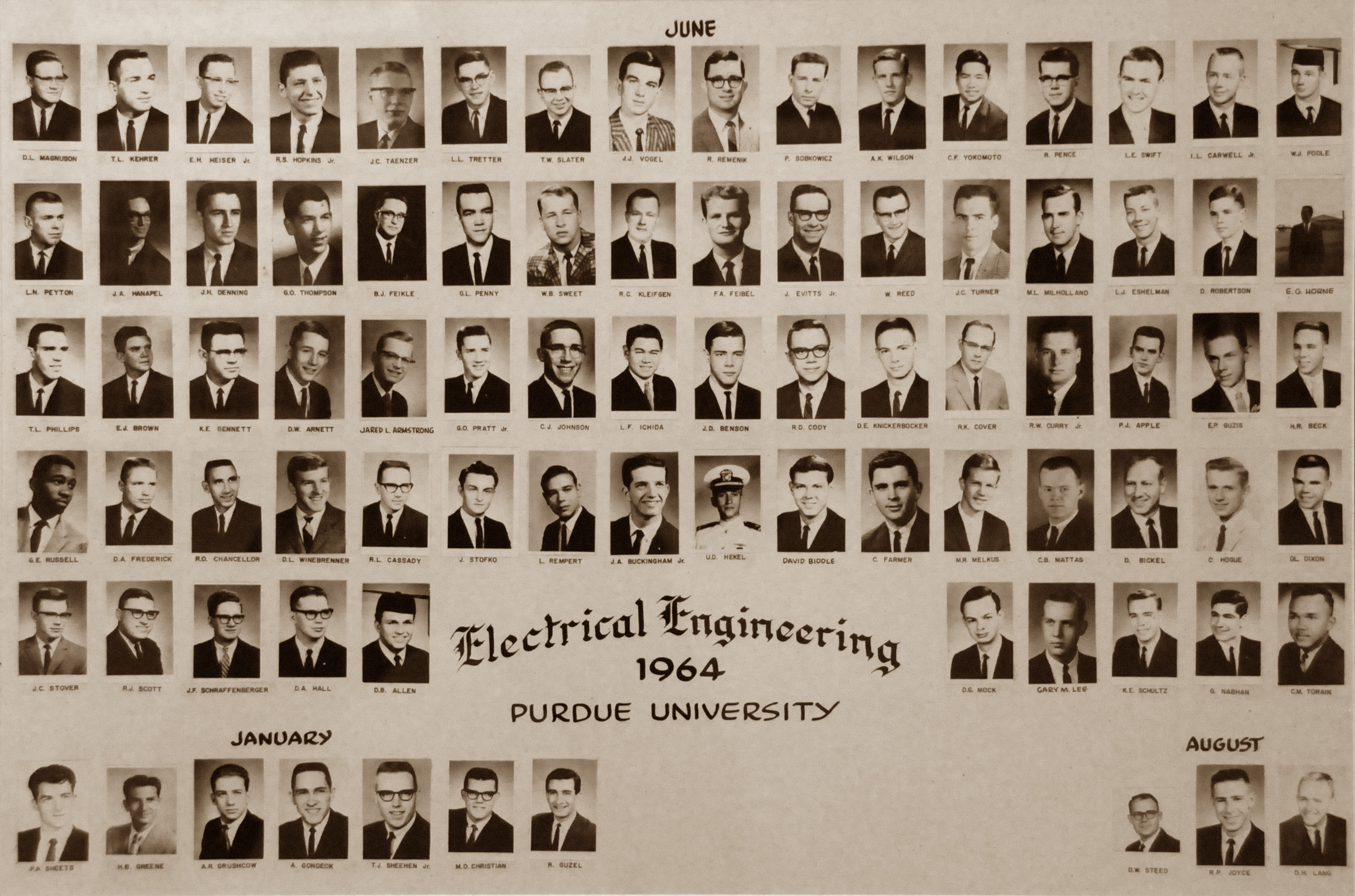 Julia was taking me to the area where there used to be a big motor lab, a lab I remember well, but a lab that was removed not long after I left Purdue, and I saw pictures hanging on the hallway wall that showed EE classes from the past. I had never seen these pictures. Immediately I wanted to see mine, from 1964. Here it is.