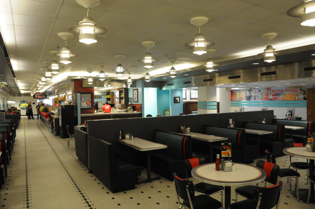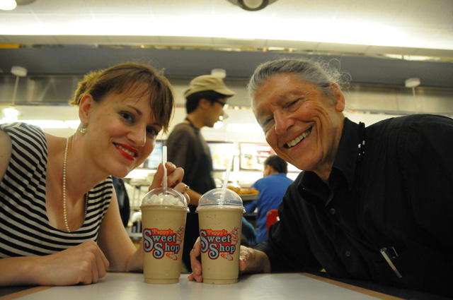 After much more discussion and exploring the EE Building with Julia, we headed to the Sweet Shop. That's what I call it. Today they call it Pappy's. The full name is "Pappy's Sweet Shop". What I cannot remember is whether that was its full name back in the early 1960s. I never knew it as Pappy's, only as the Sweet Shop. Among other things, the Sweet Shop serves chocolate shakes. Here's Julia and me getting ready to enjoy our chocolate shakes as soon as the picture is taken. We could hardly wait!