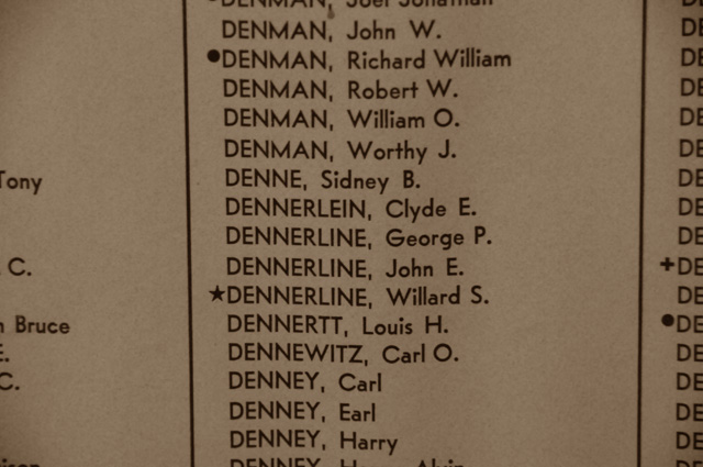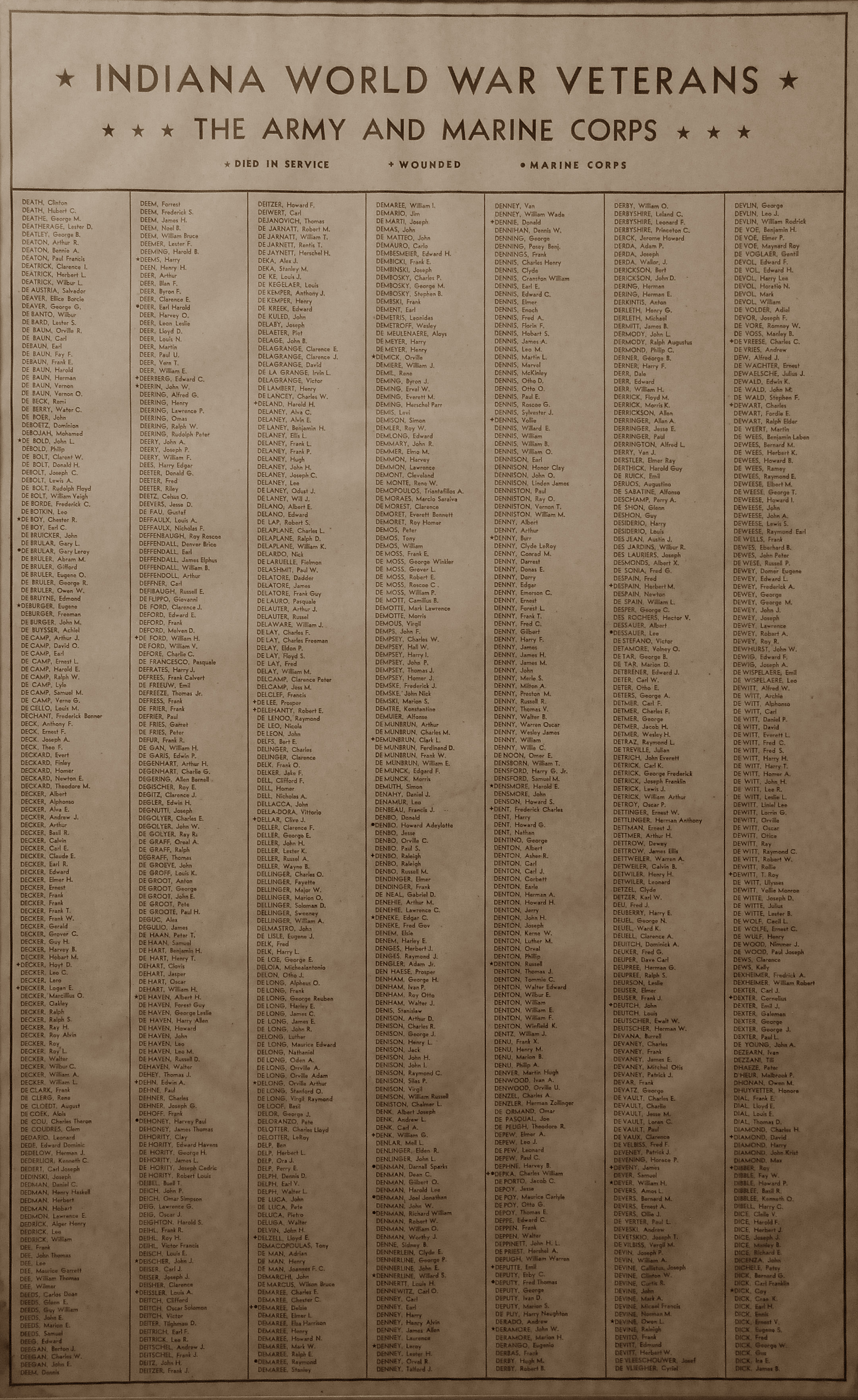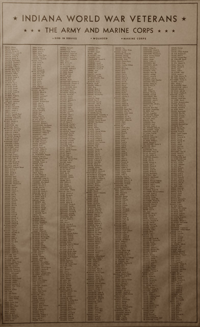 This last area is up some steps (actually many steps) and all along the steps up both sides of the Monument are large frames holding names of World War I Army and Marine Corps Veterans from Indiana. Here's one of those frames. Click on the picture to see a high resolution copy. Look at the fourth column, the fifteenth name from the bottom. You are looking for Charlotte's father, George P. Dennerline.