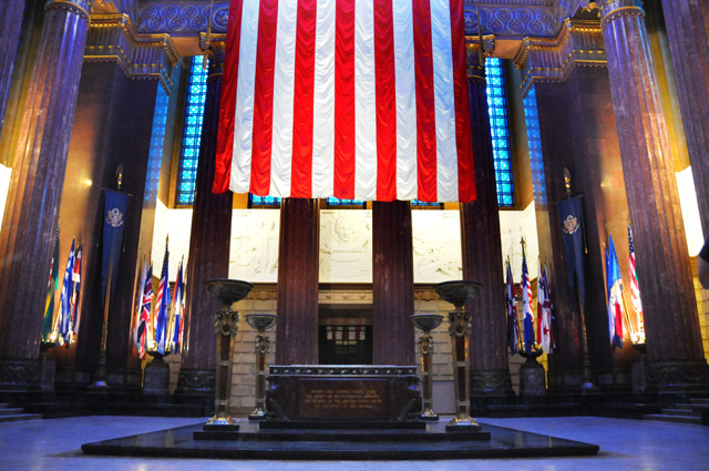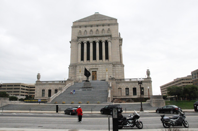 And that leads me to my second reason for returning to Indianapolis. After I was in Indianapolis earlier on this ride, Charlotte told me by email that her father's name was engraved there. I decided that I would find his name on my way back home. It turns out that names are not engraved on the Soldiers and Sailors Monument. The names are at the Indiana World War Memorial. Dean led me there on our bikes and we asked for help. Eventually, we found the name. But first, you have to see the Memorial just as we did. Here's the outside.