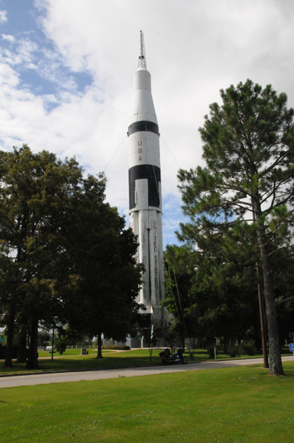 Entering Alabama from Tennessee on I-65, I saw a big rocket. I parked my bike at the foot of the rocket to compare them.