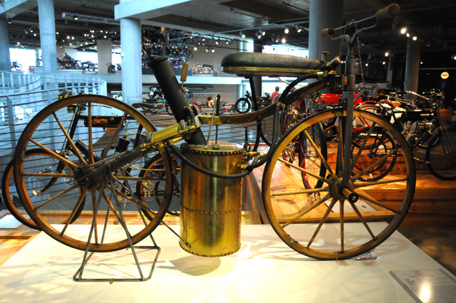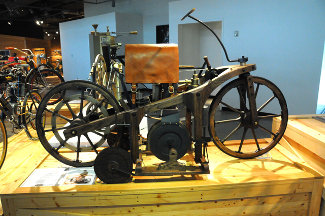 Here is an 1885 Maybach Daimler Reitwagen. It weighs 110 pounds and went 7 miles per hour. It is one of the very first motorcycles to be built.