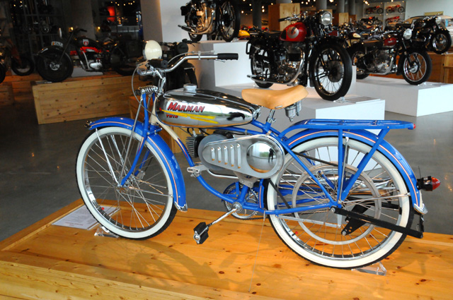 This is a 1948 Marmon/Schwinn. It has 3 1/4 horsepower. It can go 35 miles per hour and deliver 90 miles per gallon. The Marmon Products Company was established by Zeppo Marx, the youngest of the Marx brothers.