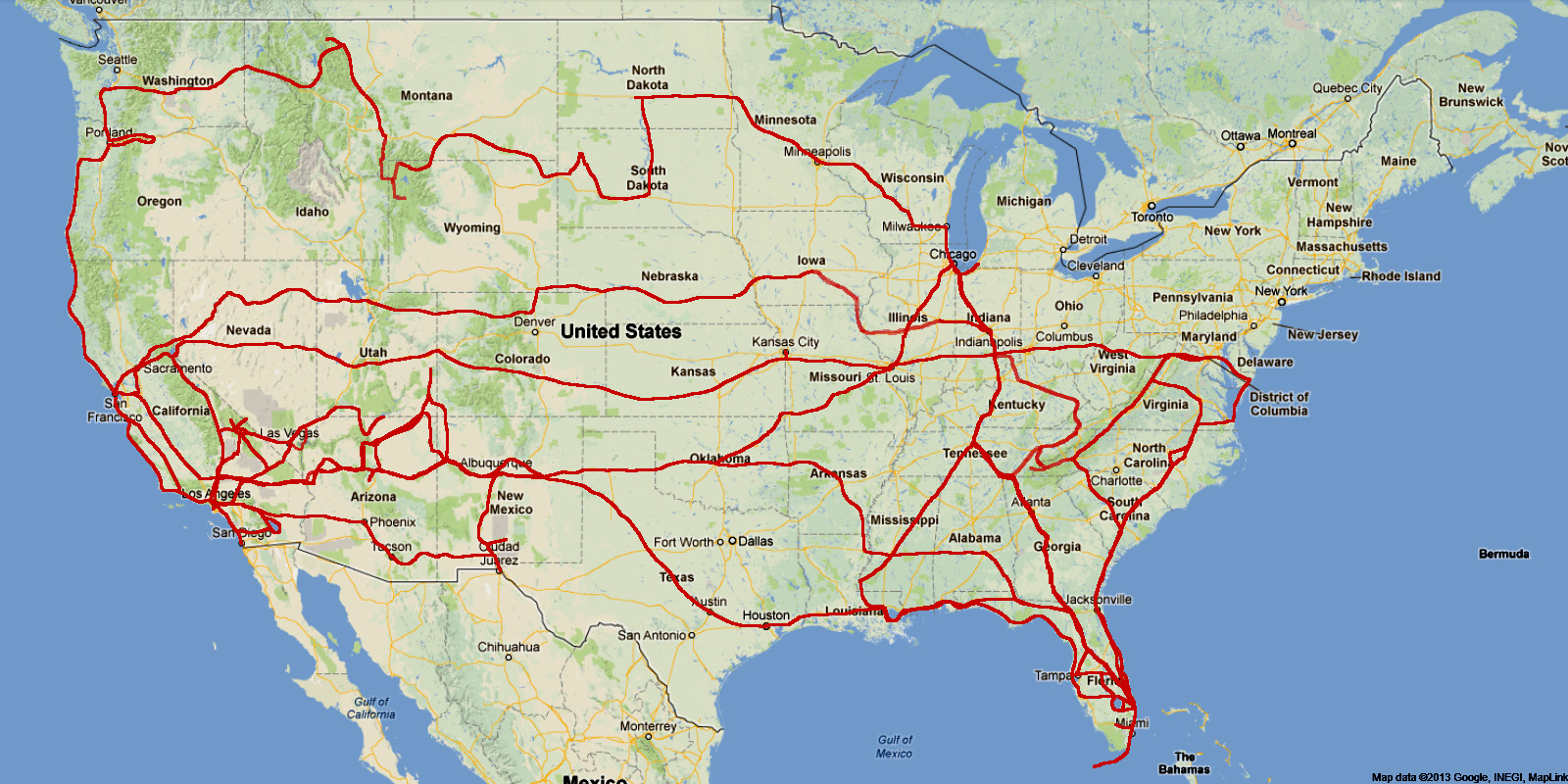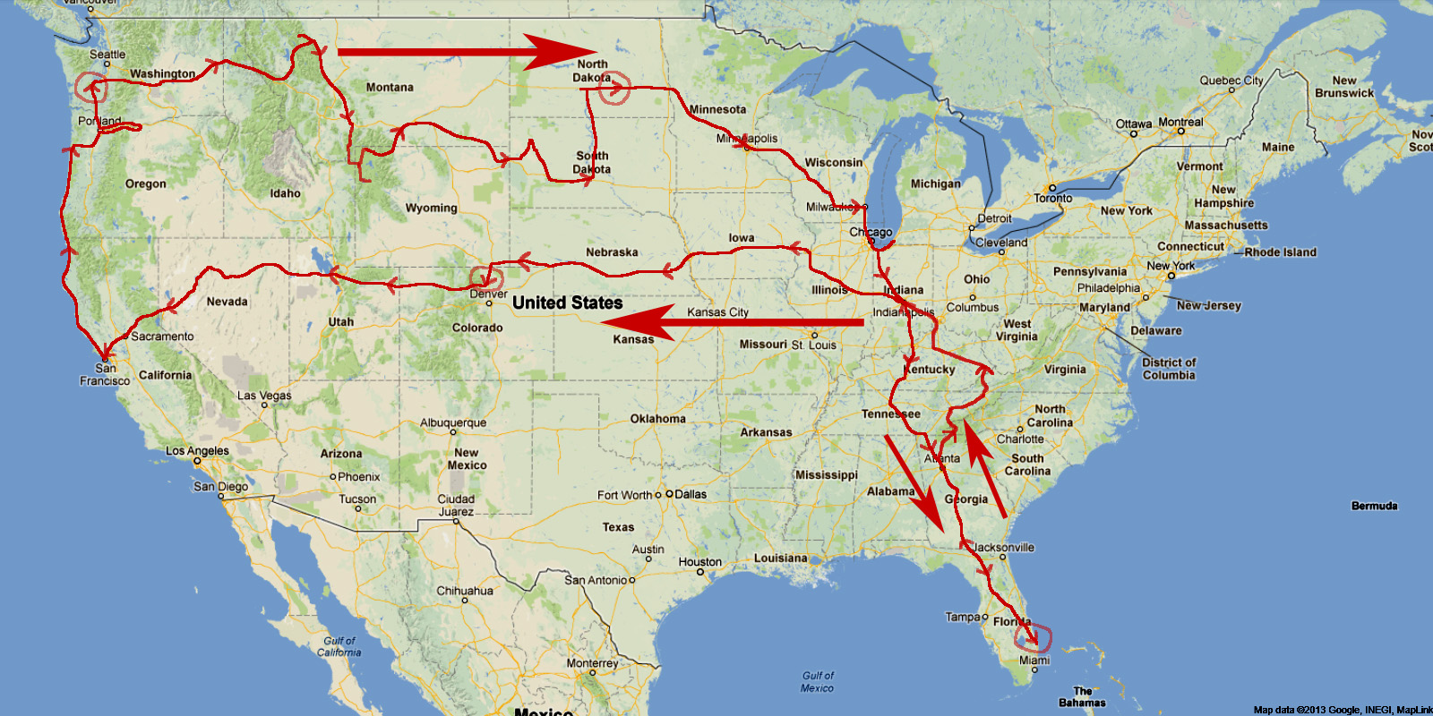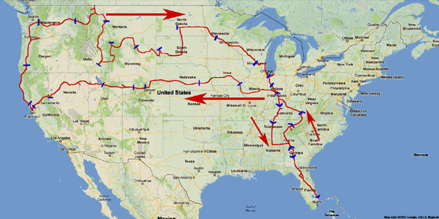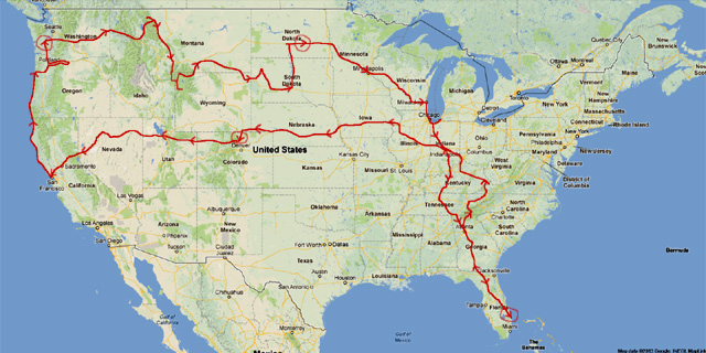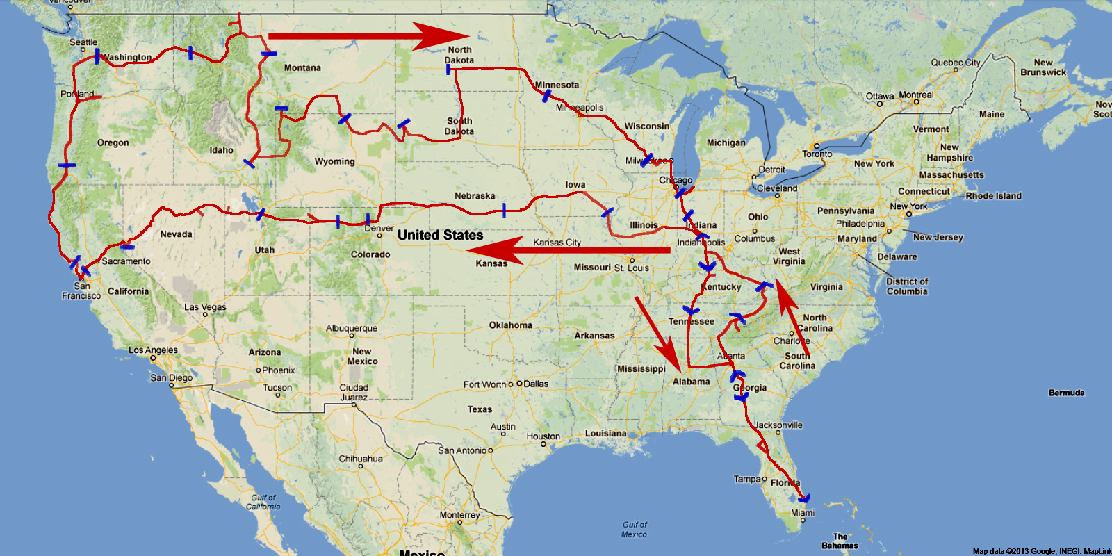 I would plan to ride about 500 miles a day if I am on Interstates, otherwise 200-300 miles a day. The trip will be more than 8,500 miles.